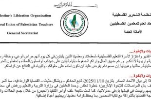 أعلن الاتحاد العام للمعلمين الفلسطينيين، اليوم السبت، خطوات نقابية تصعيدية تشمل إضراباً جزئياً لمدة ثلاثة أيام، احتجاجاً على ما وصفه بـ”تنصل الحكومة من تنفيذ اتفاقات سابقة تتعلق بصرف الرواتب وتحسين أوضاع المعلمين”. وجاء في بيان صادر عن الأمانة العامة للاتحاد، أن الحكومة لم تلتزم بتعهداتها السابقة المتعلقة بصرف مبلغ 500 شيكل خلال عشرة أيام من صرف الرواتب، إضافة إلى مستحقات …