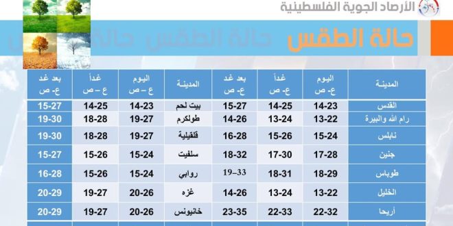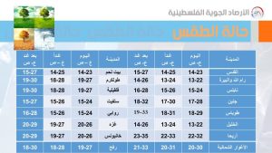 يكون الجو غائمًا جزئيا الى صاف باردا في المناطق الجبلية وباردا نسبيا في بقية المناطق، والرياح شمالية غربية خفيفة الى معتدلة السرعة والبحر خفيف ارتفاع الموج.