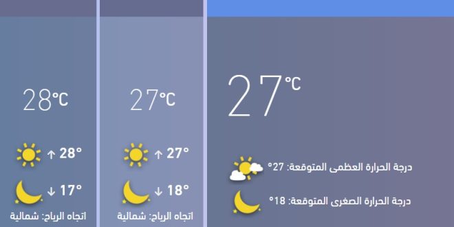 في ساعات المساء والليل: يكون الجو غائمًا جزئيا الى صاف باردا نسبيا في المناطق الجبلية ولطيفا في بقية المناطق، والرياح شمالية غربية الى شمالية شرقية خفيفة الى معتدلة السرعة والبحر خفيف ارتفاع الموج.